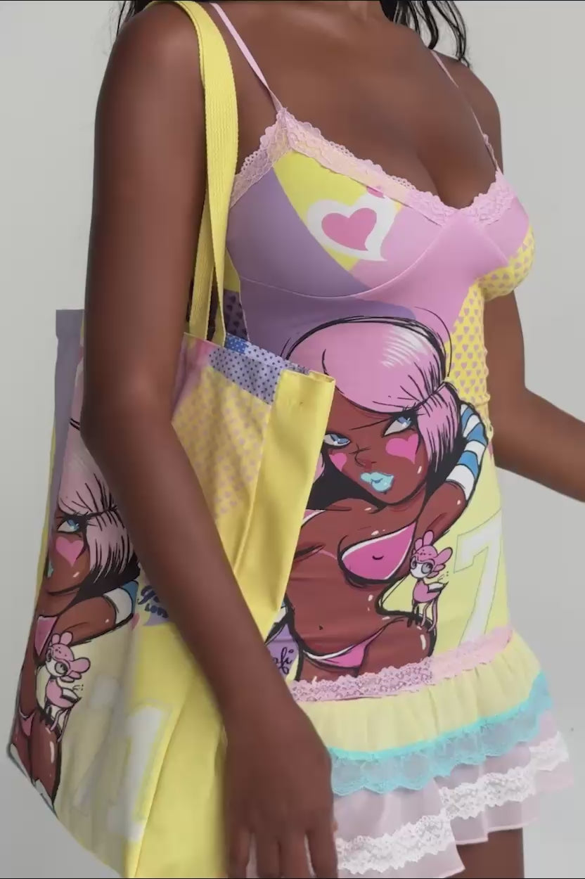 - Tote bag with all over print designed by our in-house graphic designers with custom collaboration artwork by FAFI featuring her iconic “Fafinettes”